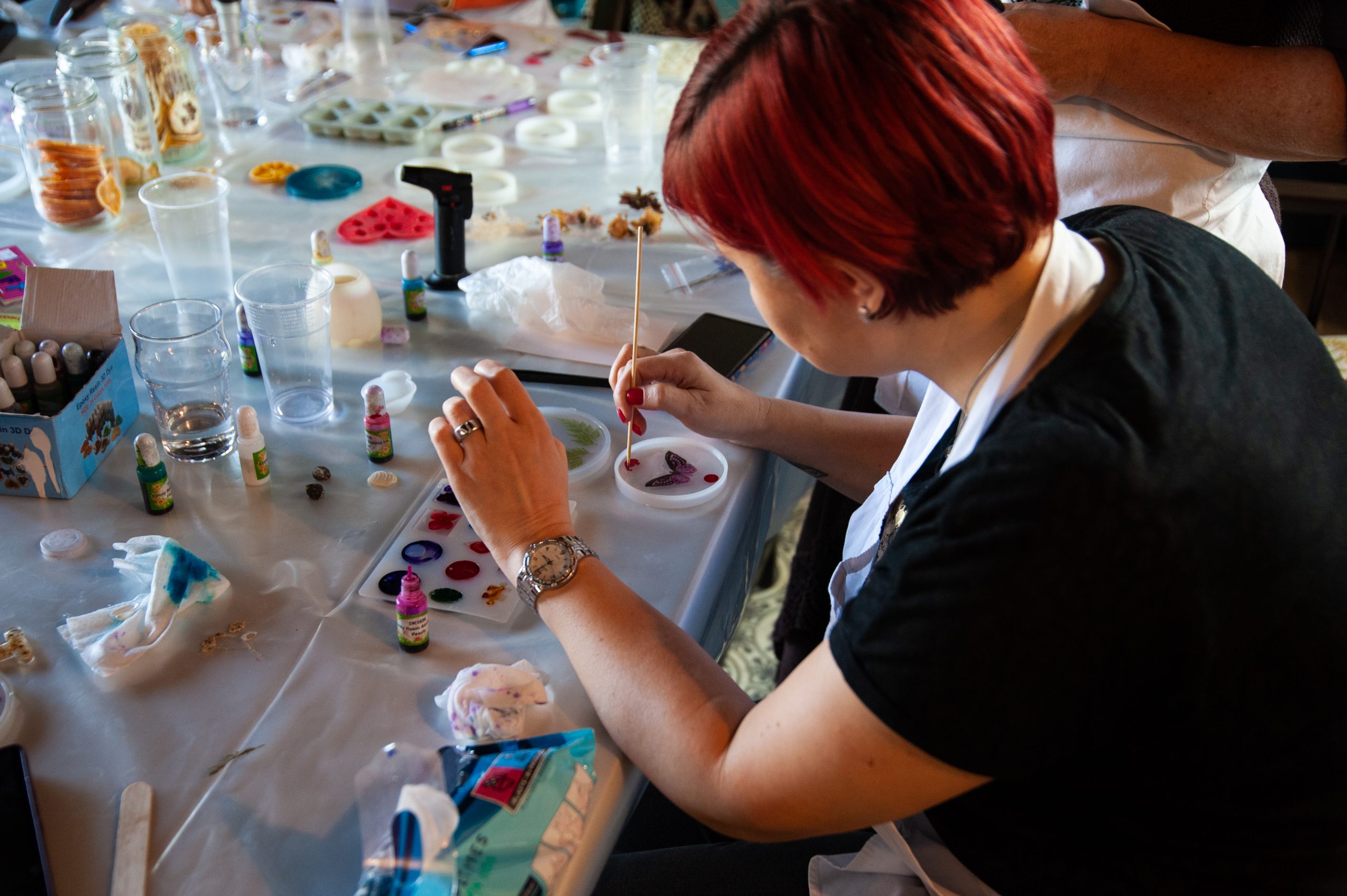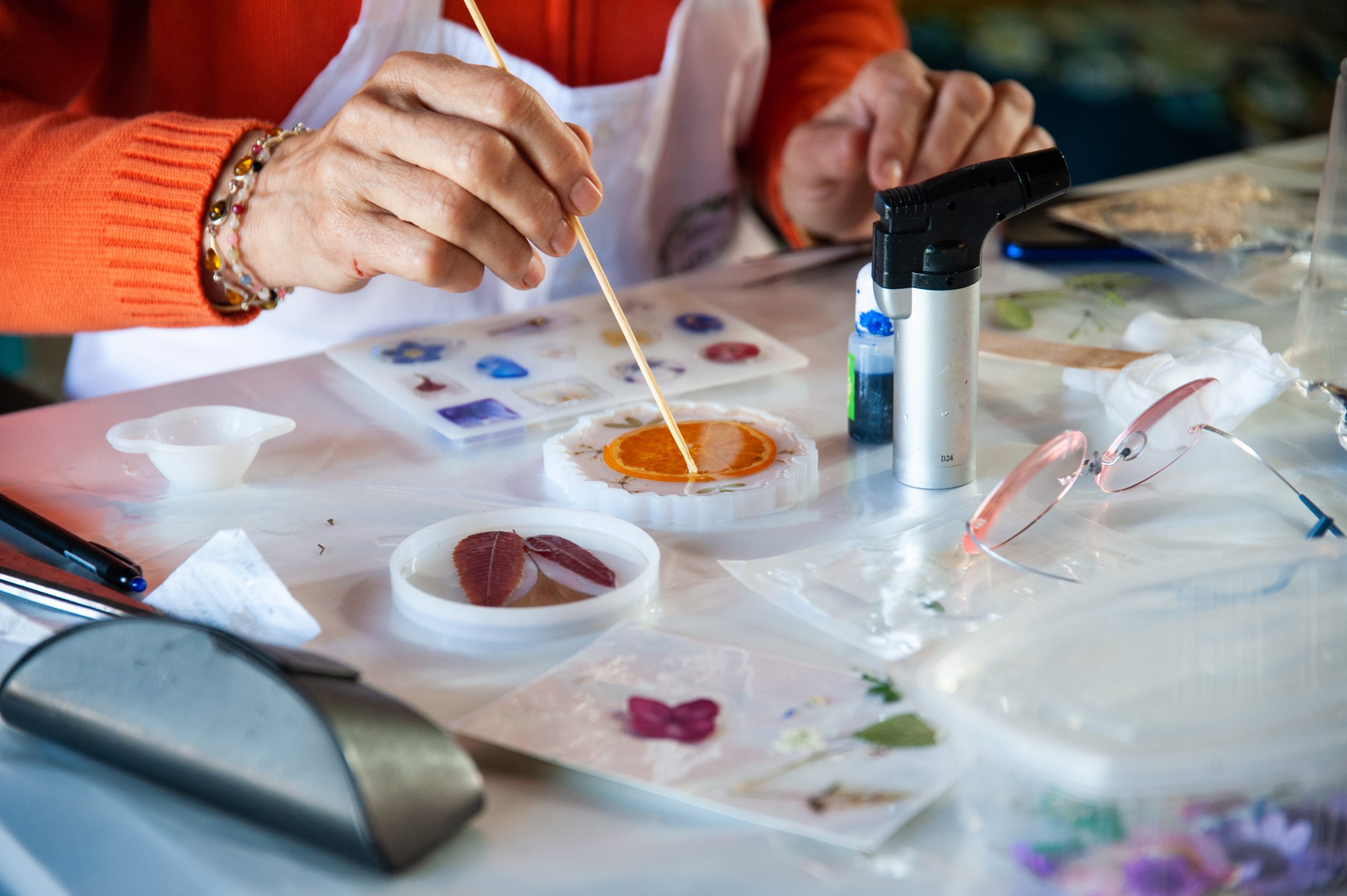- Radionica kreativnog rada sa suvim cvećem i drugim elementima u kombinaciji sa alkoholnim mastilima. Na ovoj radionici koristimo lepotu prirode za svoje kreacije. Forme i boje cveća, školjki, kamenčića nas očaravaju i zovu na kreaciju. Kombinacija sa alkoholnim mastilima nam dozvoljava da ujedno zadržimo providnost smole a da dodajemo svim ovim predmetima i slikama elemente iz prirode. Na ovoj radionici izrađujemo elemente za nakit, plitke podmetače i pripremamo se za rad na drugoj radionici, gde radimo sa mineralima.